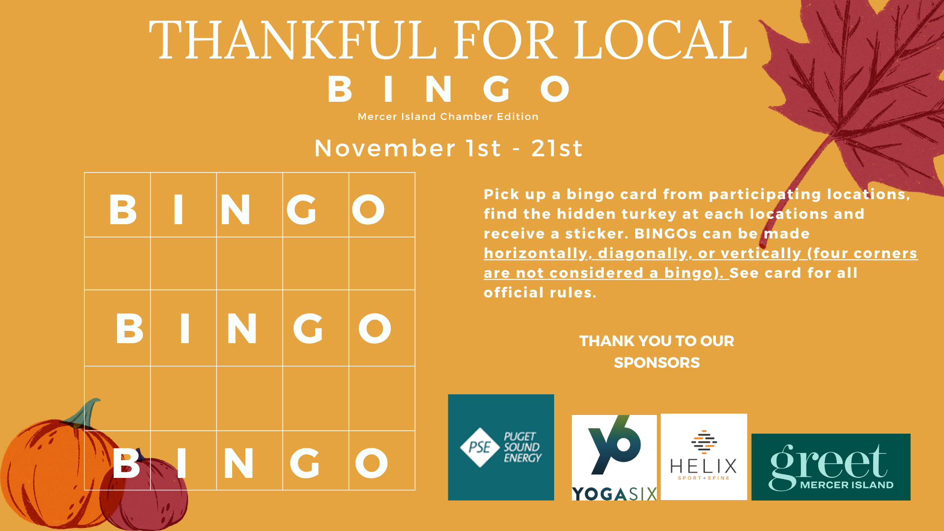 -Submit winning cards to the BINGO card box at the Mercer Island Chamber by November 21st by 6:00pm.